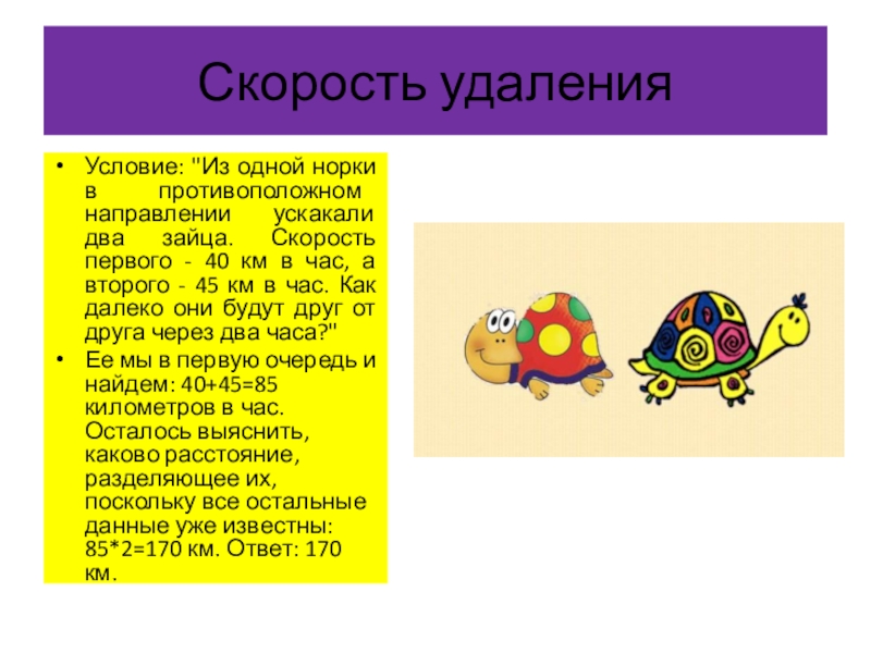 ускакали два зайца. Скорость первого - 40 км в час, а второго - 45 км в час. Как далеко они будут друг от друга через два часа?"