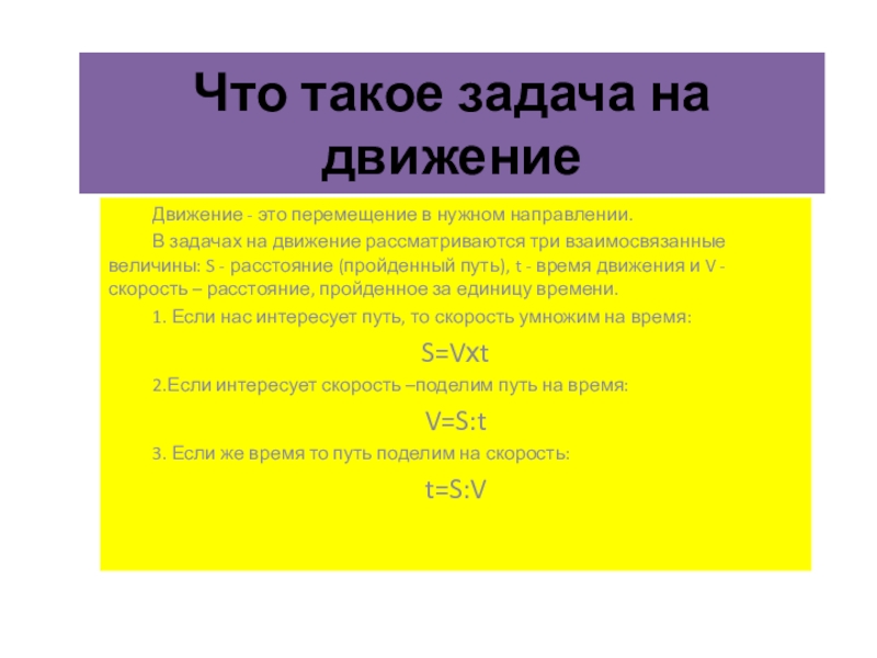 задачах на движение рассматриваются три взаимосвязанные величины: S - расстояние (пройденный путь), t - время движения и V - скорость – расстояние, пройденное за единицу времени.