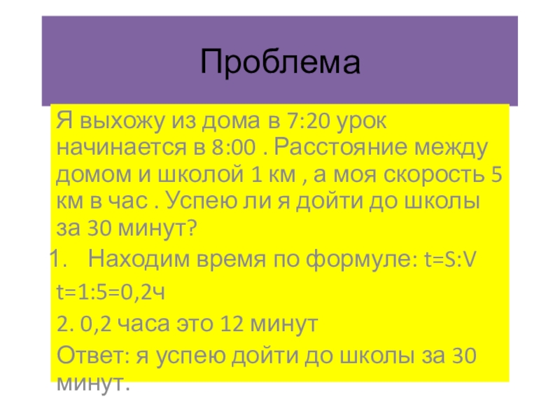 Расстояние между домом и школой 1 км , а моя скорость 5 км в час . Успею ли я дойти до школы за 30 минут?