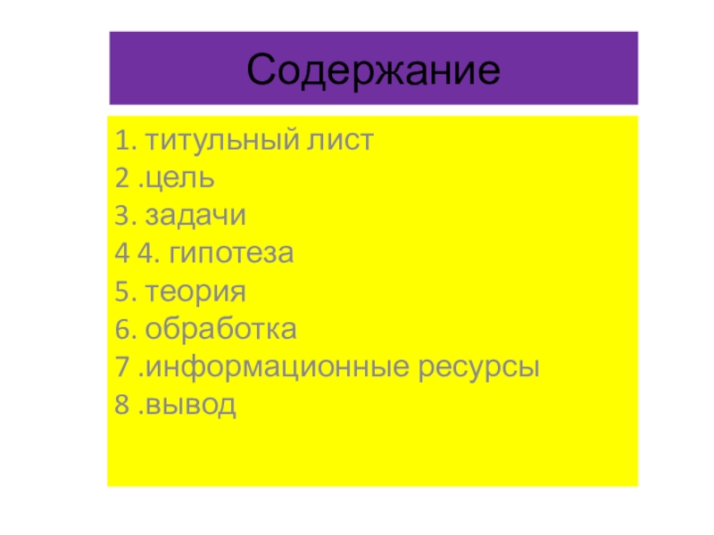 2 .цель 3. задачи 4 4. гипотеза 5. теория 6. обработка 7 .информационные ресурсы 8 .вывод
