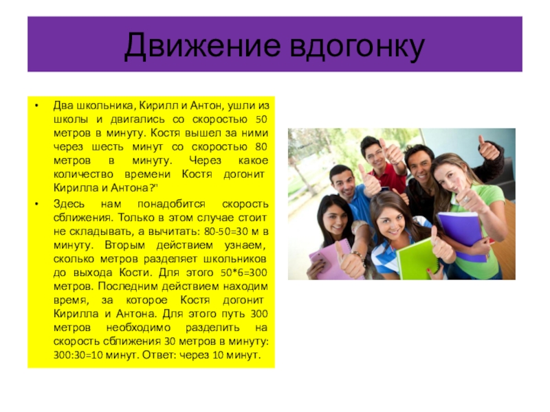 Здесь нам понадобится скорость сближения. Только в этом случае стоит не складывать, а вычитать: 80-50=30 м в минуту. Вторым действием узнаем, сколько метров разделяет школьников до выхода Кости. Для этого 50*6=300 метров. Последним действием находим время, за которое Костя догонит Кирилла и Антона. Для этого путь 300 метров необходимо разделить на скорость сближения 30 метров в минуту: 300:30=10 минут. Ответ: через 10 минут.