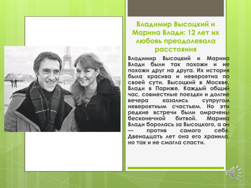 Владимир Высоцкий и Марина Влади были так похожи и не похожи друг на друга. Их история была красива и невероятна по своей сути. Высоцкий в Москве, Влади в Париже. Каждый общий час, совместные поездки и долгие вечера казались супругам невероятным счастьем. Но эти редкие встречи были омрачены бесконечной битвой. Марина Влади боролась за Высоцкого, а он — против самого себя. Двенадцать лет она его хранила, но так и не смогла спасти.