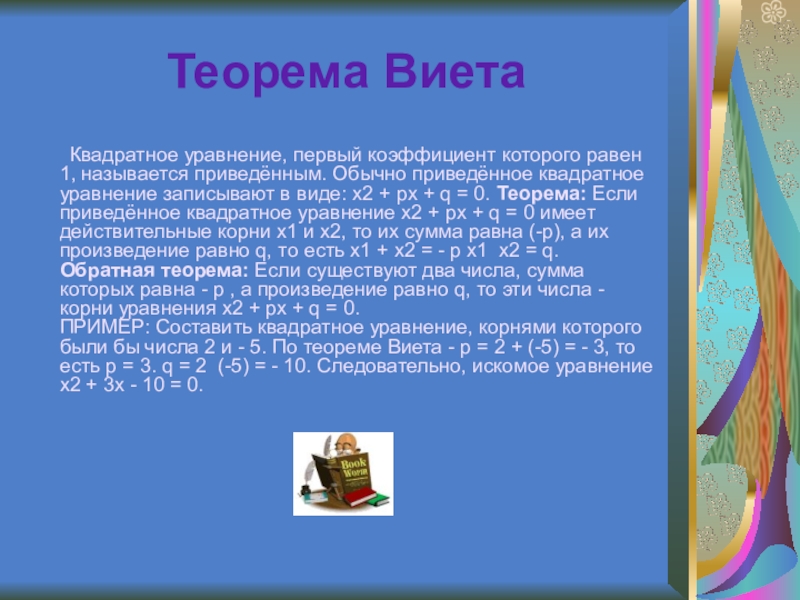 приведённым. Обычно приведённое квадратное уравнение записывают в виде: x2 + px + q = 0. Теорема: Если приведённое квадратное уравнение x2 + px + q = 0 имеет действительные корни х1 и х2, то их сумма равна (-p), а их произведение равно q, то есть х1 + х2 = - р х1 х2 = q. Обратная теорема: Если существуют два числа, сумма которых равна - р , а произведение равно q, то эти числа - корни уравнения x2 + px + q = 0.