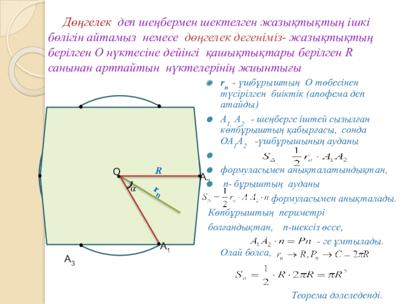 А1, А2 - шеңберге іштей сызылған көпбұрыштың қабырғасы, сонда ОА1А2 -үшбұрышының ауданы