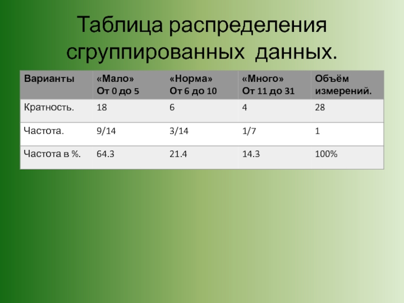 Числовые характеристики.Размах измерения: 31-0=31Мода измерения:1Медиана измерения: (2+3)/2=2,5Среднее значение:(1+4+9+4+5+12+21+10+11+12+61)/28=5,4