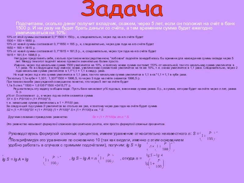 Руководствуясь формулой сложных процентов, имеем уравнение относительно неизвестного n: S = A