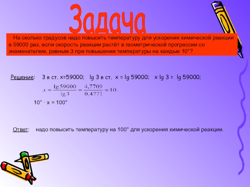 На сколько градусов надо повысить температуру для ускорения химической реакции в 59000 раз, если скорость реакции растёт в геометрической прогрессии со знаменателем, равным 3 при повышении температуры на каждые 10°?