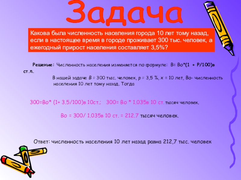 Какова была численность населения города 10 лет тому назад, если в настоящее время в городе проживает 300 тыс. человек, а ежегодный прирост населения составляет 3,5%?