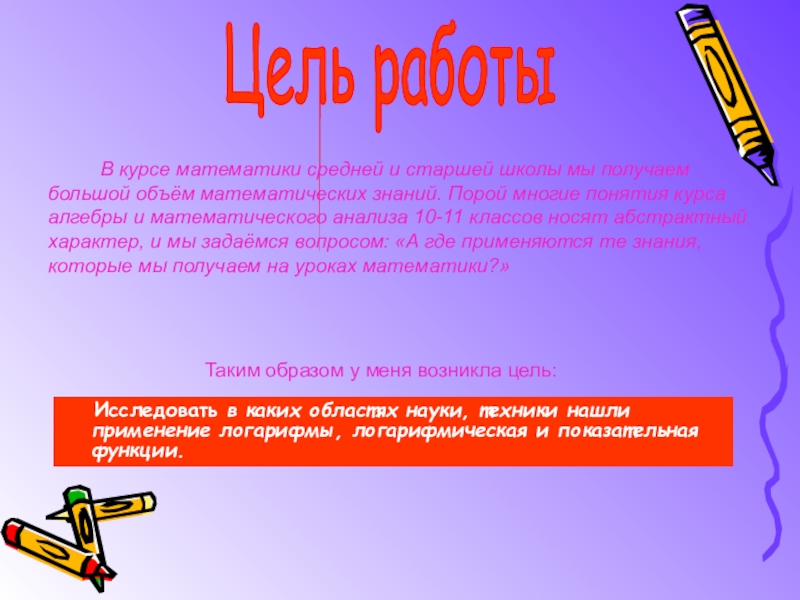 В курсе математики средней и старшей школы мы получаем большой объём математических знаний. Порой многие понятия курса алгебры и математического анализа 10-11 классов носят абстрактный характер, и мы задаёмся вопросом: «А где применяются те знания, которые мы получаем на уроках математики?»