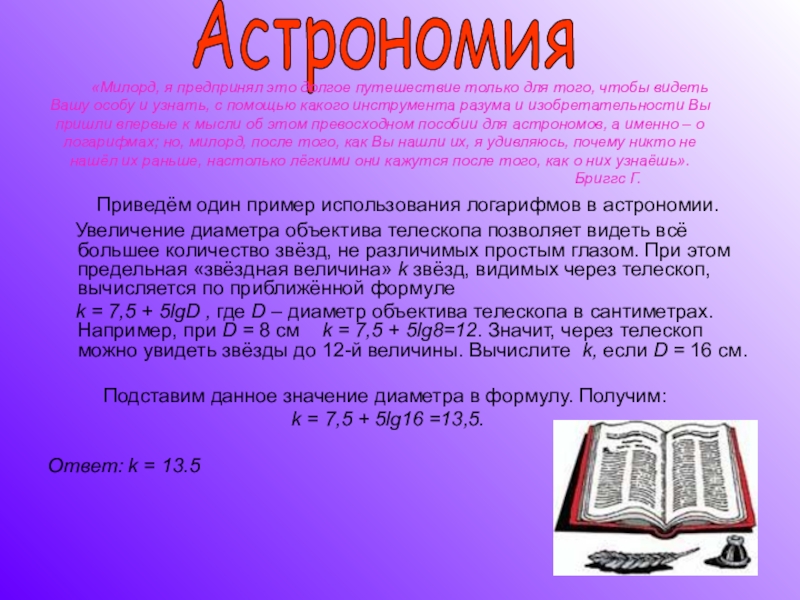 «Милорд, я предпринял это долгое путешествие только для того, чтобы видеть Вашу особу и узнать, с помощью какого инструмента разума и изобретательности Вы пришли впервые к мысли об этом превосходном пособии для астрономов, а именно – о логарифмах; но, милорд, после того, как Вы нашли их, я удивляюсь, почему никто не нашёл их раньше, настолько лёгкими они кажутся после того, как о них узнаёшь».