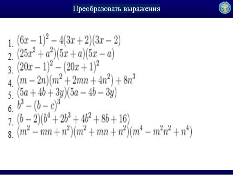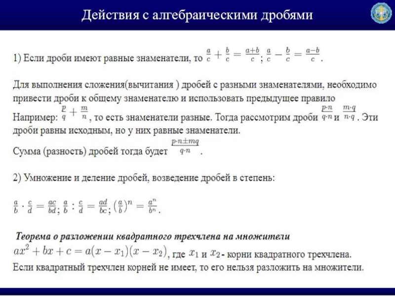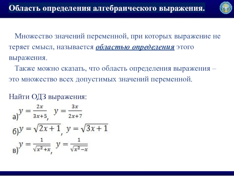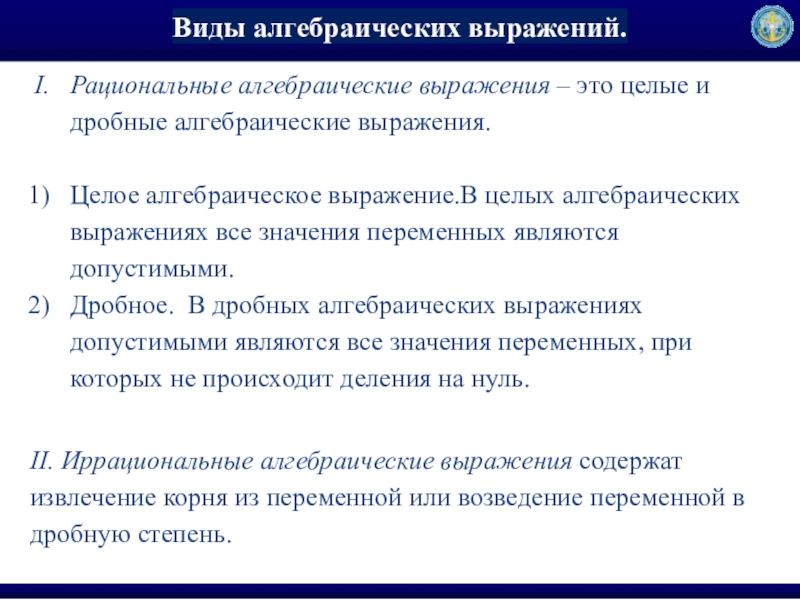 Алгебраическим выражением называется одна или несколько алгебраических величин (чисел и букв), соединенных между собой знаками алгебраических действий: сложения, вычитания, умножения и деления, а также извлечения корня и возведения в целую степень и знаками последовательности этих действий (обычно скобками различного вида).