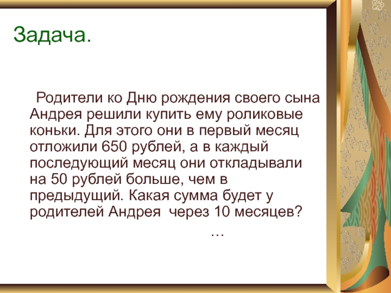 Задача.   Родители ко Дню рождения своего сына Андрея решили купить ему роликовые коньки. Для этого