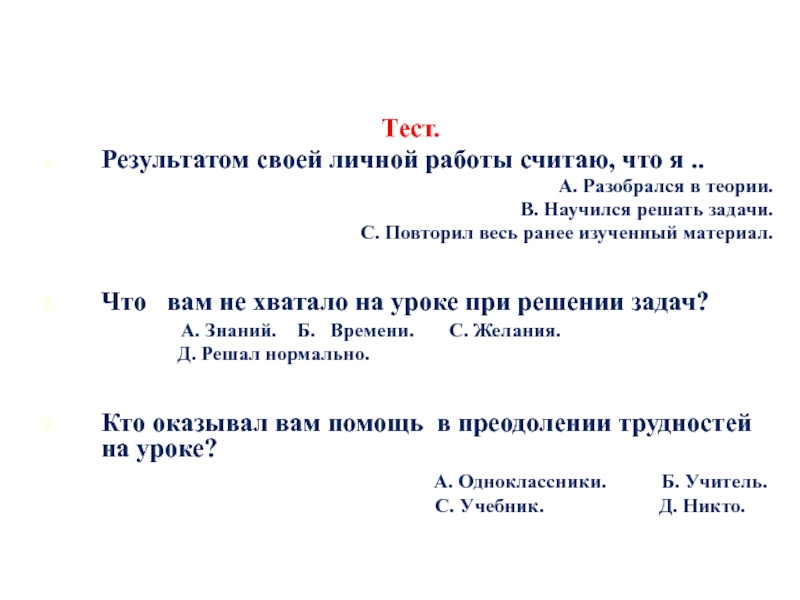 Тест.Результатом своей личной работы считаю, что я ..А. Разобрался в теории.В. Научился решать задачи.С. Повторил весь ранее