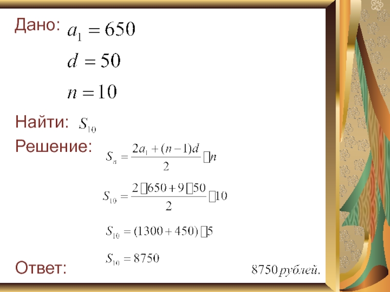 решили купить ему роликовые коньки. Для этого они в первый месяц отложили 650 рублей, а в каждый последующий месяц они откладывали на 50 рублей больше, чем в предыдущий. Какая сумма будет у родителей Андрея через 10 месяцев?