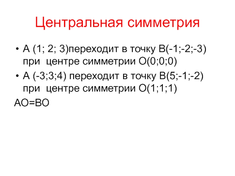 Центральная симметрияА (1; 2; 3)переходит в точку В(-1;-2;-3) при центре симметрии О(0;0;0)А (-3;3;4) переходит в точку В(5;-1;-2)