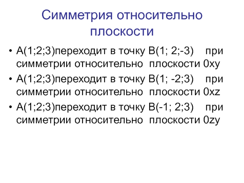 Симметрия относительно плоскостиА(1;2;3)переходит в точку В(1; 2;-3)  при симметрии относительно плоскости 0хуА(1;2;3)переходит в точку В(1; -2;3)