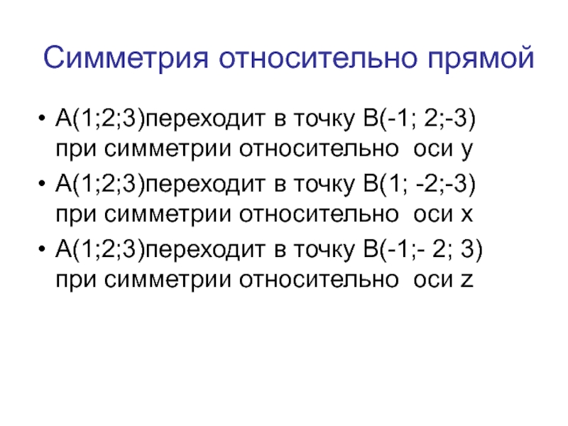 Симметрия относительно прямойА(1;2;3)переходит в точку В(-1; 2;-3)  при симметрии относительно оси уА(1;2;3)переходит в точку В(1; -2;-3)