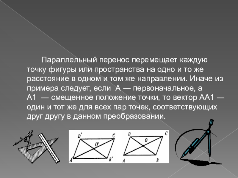 Слайд 35 Параллельный перенос перемещает каждую точку фигуры или пространства на одно