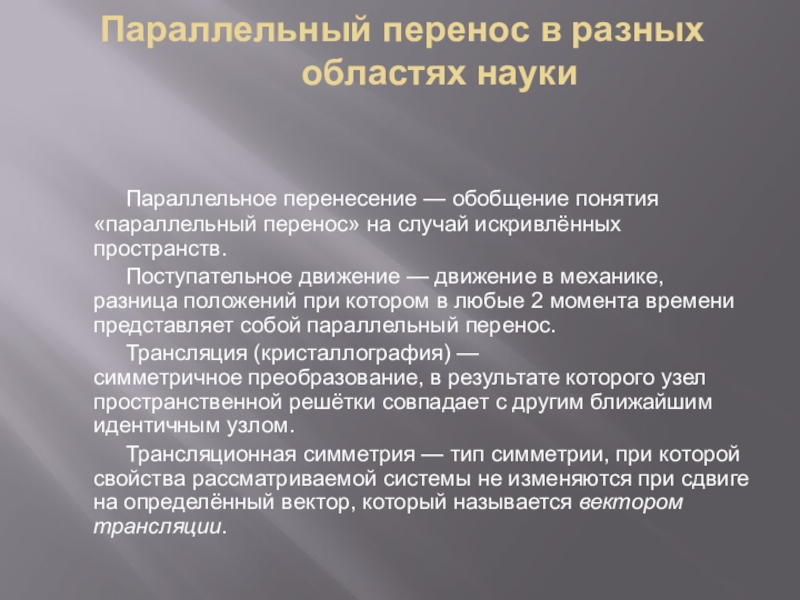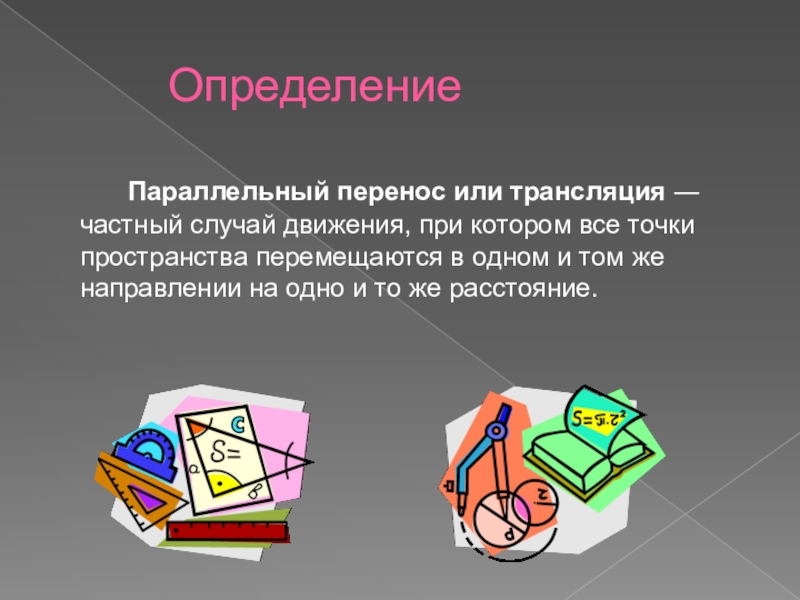 Параллельный перенос или трансляция ― частный случай движения, при котором все точки пространства перемещаются в