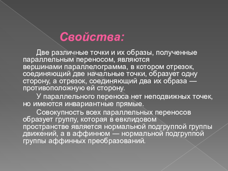 Совокупность всех параллельных переносов образует группу, которая в евклидовом пространстве является нормальной подгруппой группы движений, а в аффинном ― нормальной подгруппой группы аффинных преобразований.