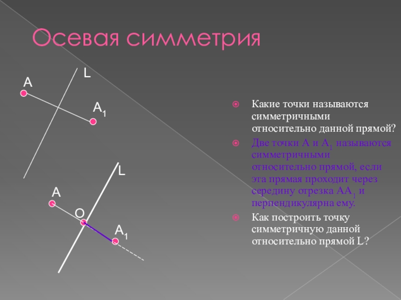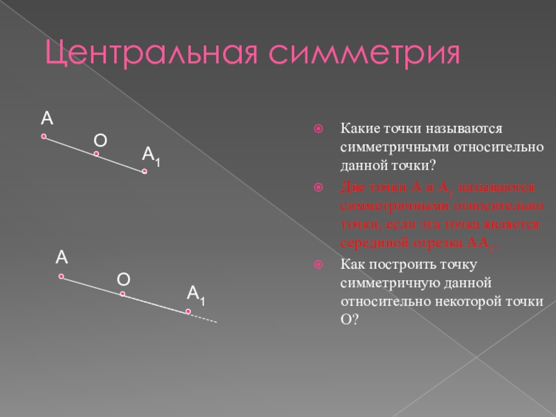 и А1 называются симметричными относительно точки, если эта точка является серединой отрезка АА1.
