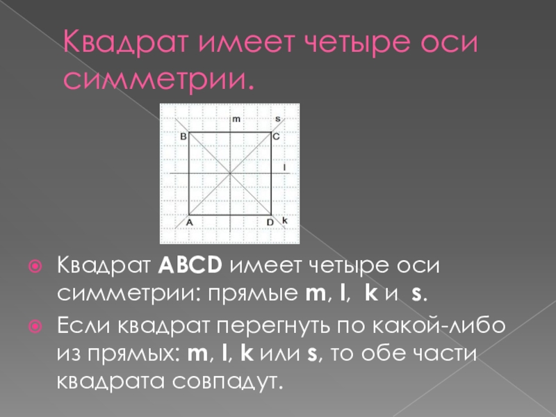 Если квадрат перегнуть по какой-либо из прямых: m, l, k или s, то обе части квадрата совпадут.