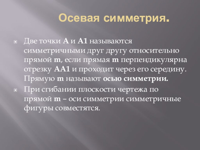 относительно прямой m, если прямая m перпендикулярна отрезку АА1 и проходит через его середину. Прямую m называют осью симметрии.