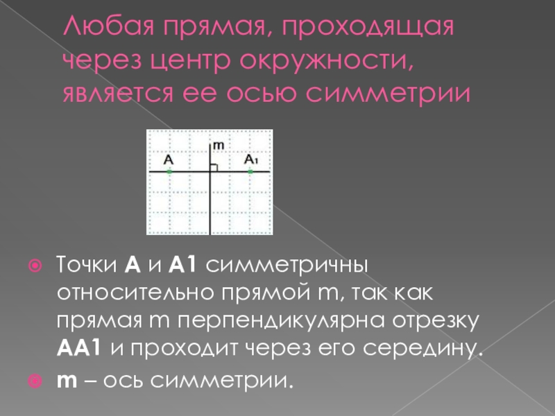 Слайд 16Любая прямая, проходящая через центр окружности, является ее осью симметрии