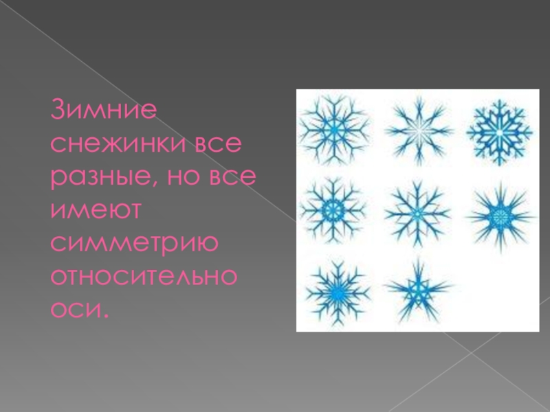 Слайд 15Зимние снежинки все разные, но все имеют симметрию относительно оси.