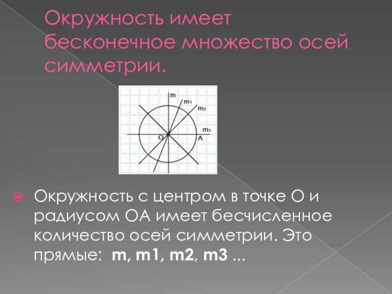 и радиусом ОА имеет бесчисленное количество осей симметрии. Это прямые: m, m1, m2, m3 ...