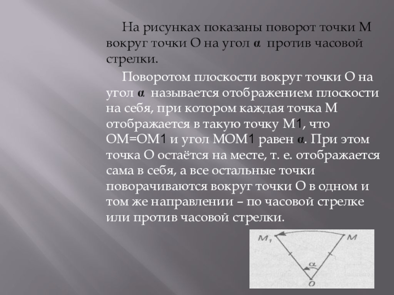 Слайд 41 На рисунках показаны поворот точки M вокруг точки О на угол