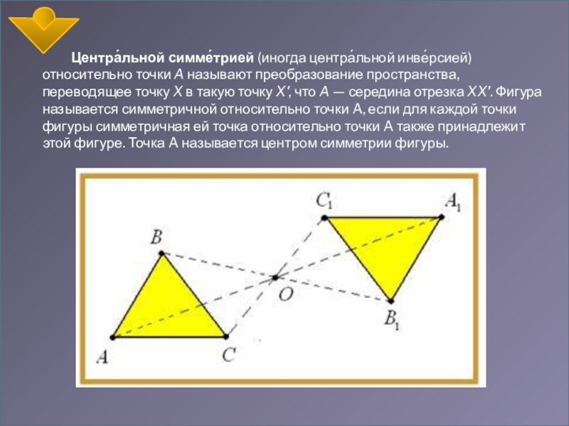 Слайд 7 Центра́льной симме́трией (иногда центра́льной инве́рсией) относительно точки A называют преобразование пространства, переводящее точку X в такую точку X′,
