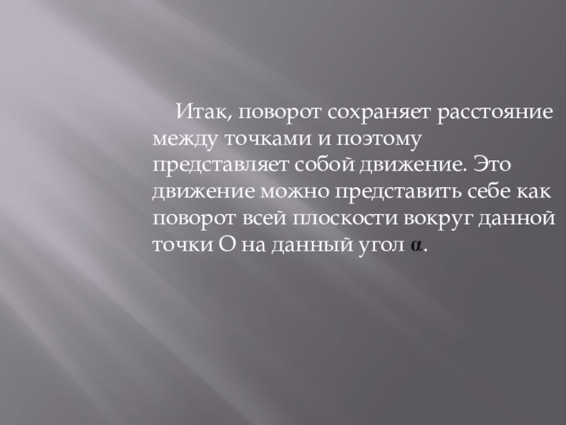 Слайд 43 Итак, поворот сохраняет расстояние между точками и поэтому представляет собой движение.