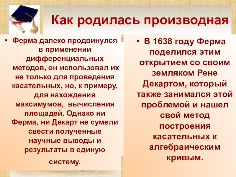 Ферма далеко продвинулся в применении дифференциальных методов, он использовал их не только для проведения касательных, но, к примеру, для нахождения максимумов, вычисления площадей. Однако ни Ферма, ни Декарт не сумели свести полученные научные выводы и результаты в единую систему.