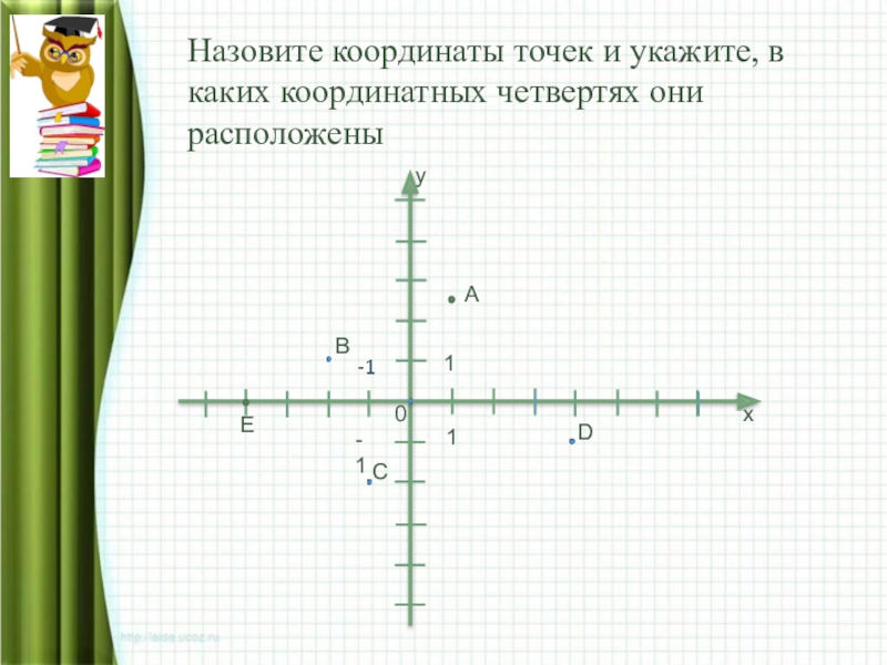 Слайд 13Назовите координаты точек и укажите, в каких координатных четвертях они расположены