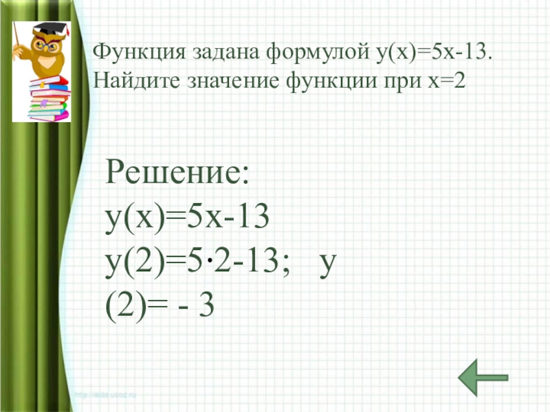 Слайд 11Функция задана формулой у(х)=5х-13. Найдите значение функции при х=2