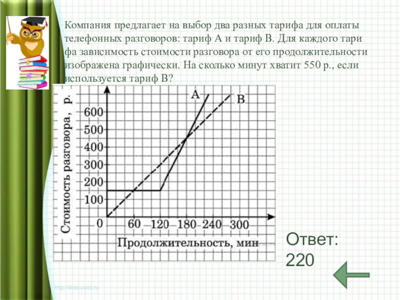 тариф А и тариф В. Для каждого тарифа зависимость стоимости разговора от его продолжительности изображена графически. На сколько минут хватит 550 р., если используется тариф В?