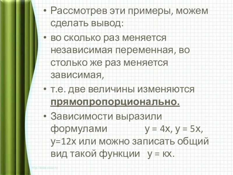 Зависимости выразили формулами у = 4х, у = 5х, у=12х или можно записать общий вид такой функции у = кх.