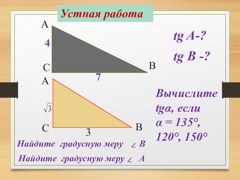 Если на рисунке нет касательной, но известны точки, через которые она проходит, сначала надо провести касательную, а потом рассмотреть прямоугольный треугольник, в котором найти отношение катетов.