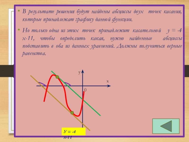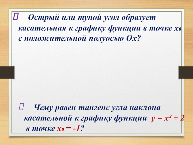 Если угол наклона касательной к положительному направлению оси Ох тупой, то угловой коэффициент касательной и значение производной функции в точке отрицательны.