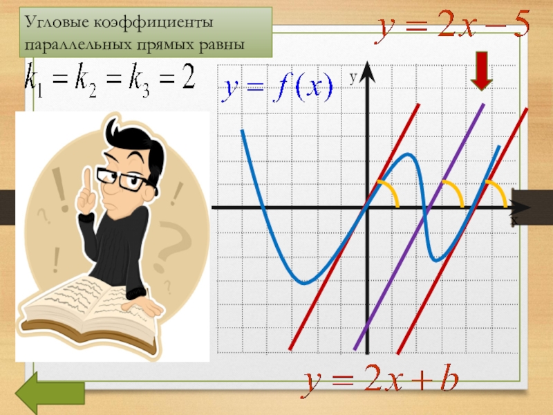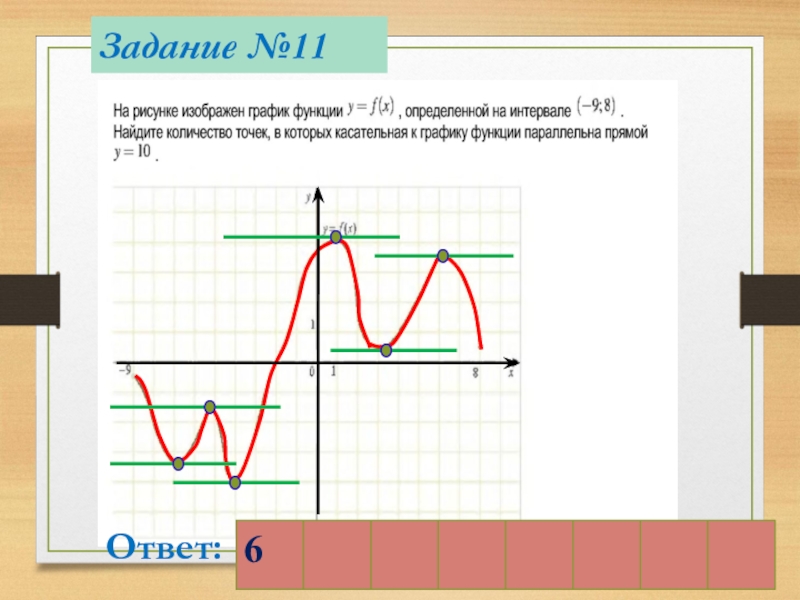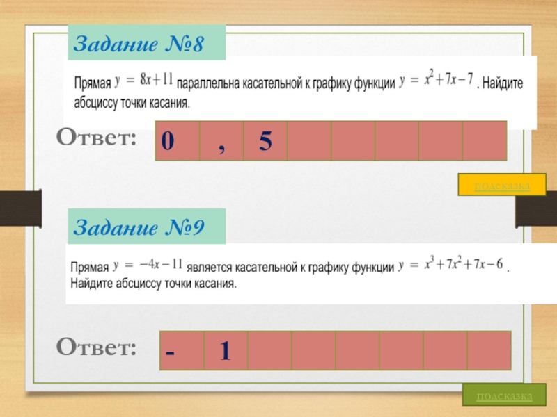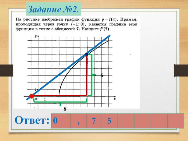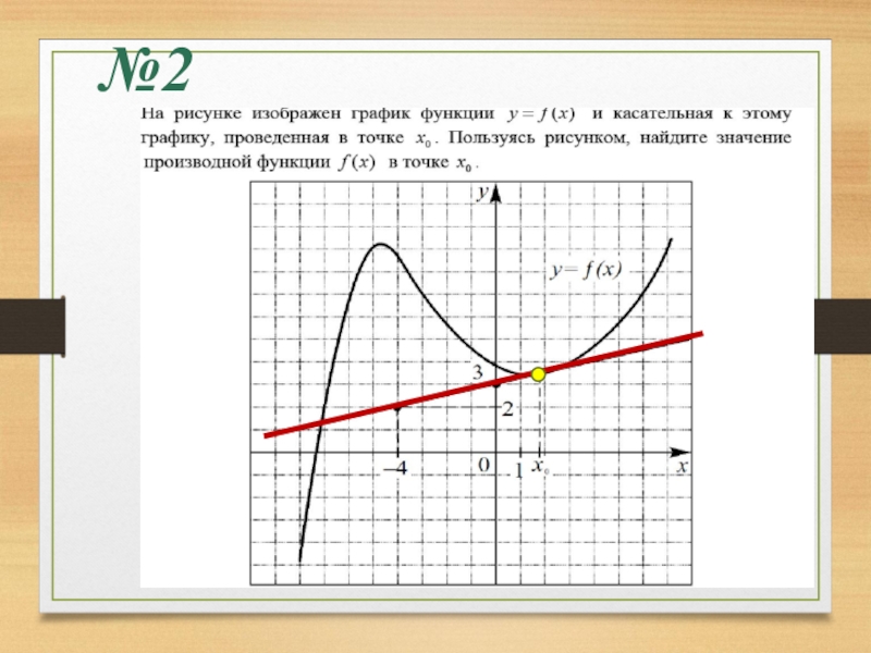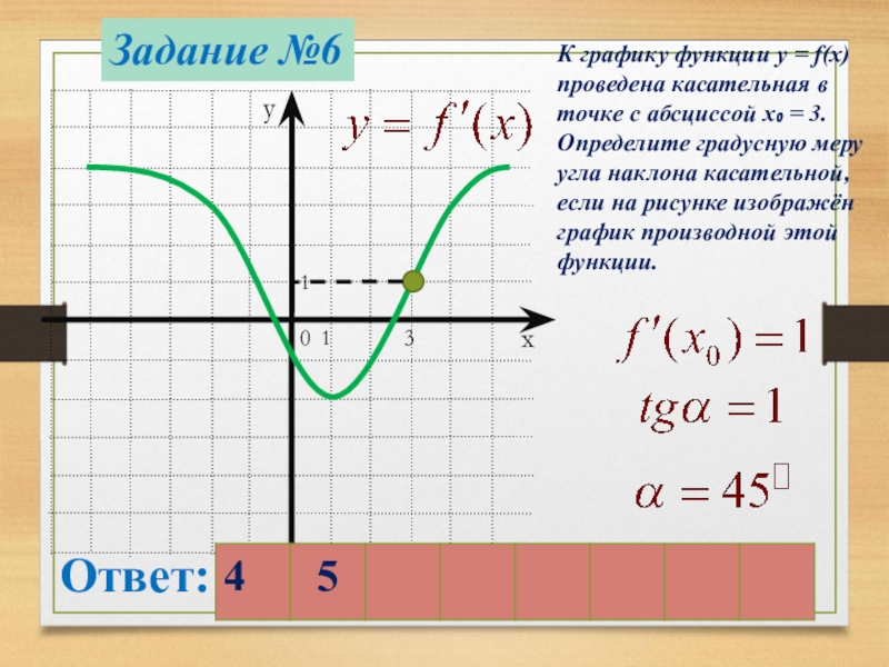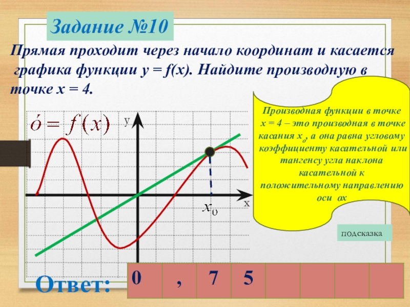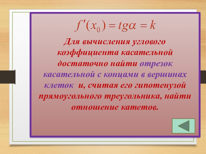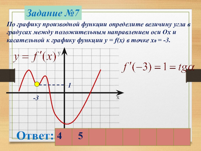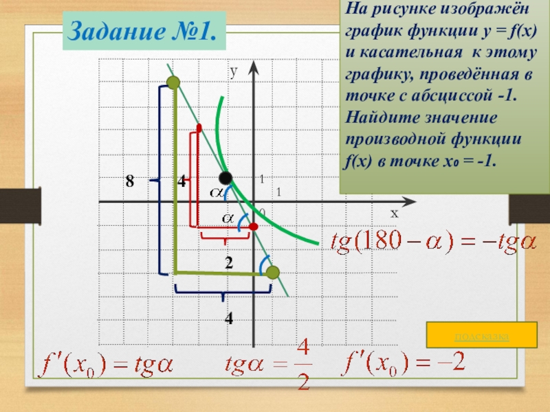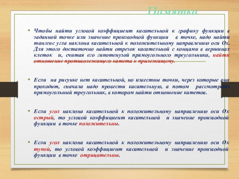 Чтобы найти угловой коэффициент касательной к графику функции в заданной точке или значение производной функции в точке, надо найти тангенс угла наклона касательной к положительному направлению оси Ох. Для этого достаточно найти отрезок касательной с концами в вершинах клеток и, считая его гипотенузой прямоугольного треугольника, найти отношение противолежащего катета к прилежащему.