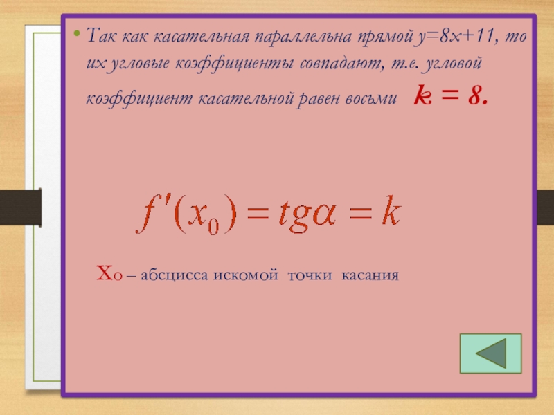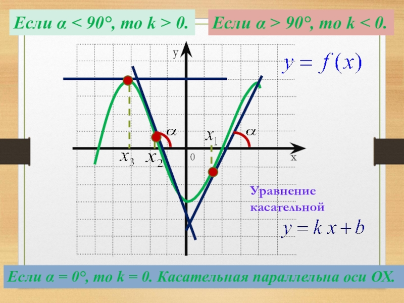 Если α = 0°, то k = 0. Касательная параллельна оси ОХ.