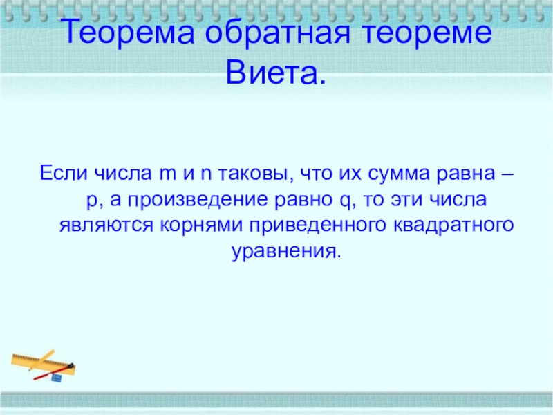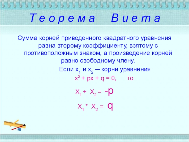 Сумма корней приведенного квадратного уравнения равна второму коэффициенту, взятому с противоположным знаком, а произведение корней равно свободному члену.