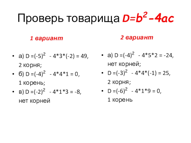 а) D =(-4)2 - 4*5*2 = -24,
