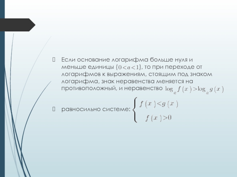 Слайд 5Если основание логарифма больше нуля и меньше единицы (