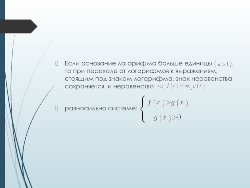 Слайд 4Если основание логарифма больше единицы ( ), то