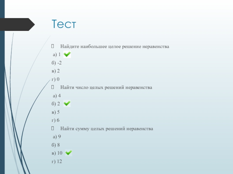 ТестНайдите наибольшее целое решение неравенства а) 1б) -2 в) 2г) 0Найти число целых решений неравенства а) 4б) 2в) 5г)