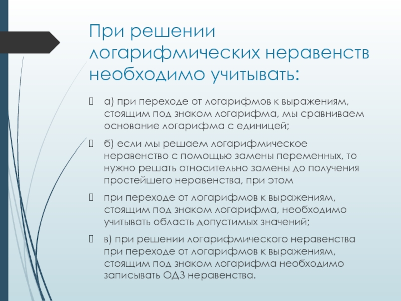 Слайд 2При решении логарифмических неравенств необходимо учитывать: