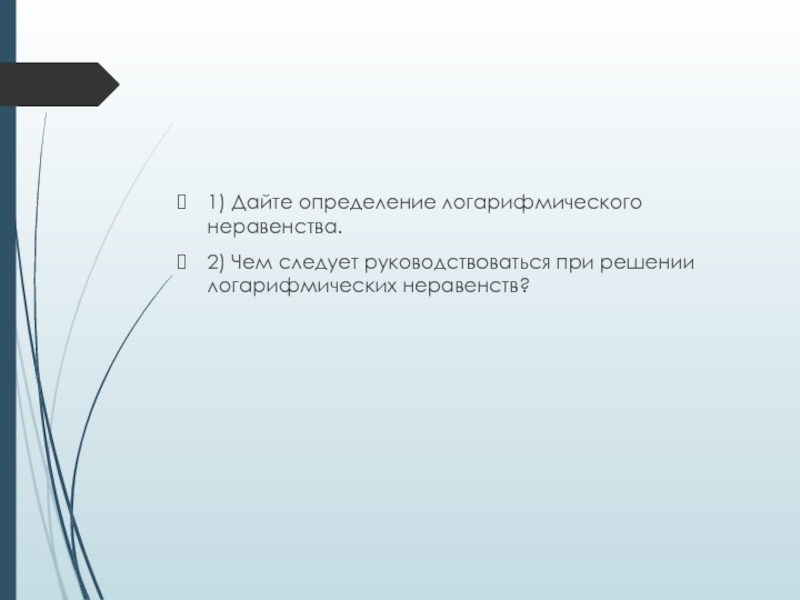 1) Дайте определение логарифмического неравенства. 2) Чем следует руководствоваться при решении логарифмических неравенств?