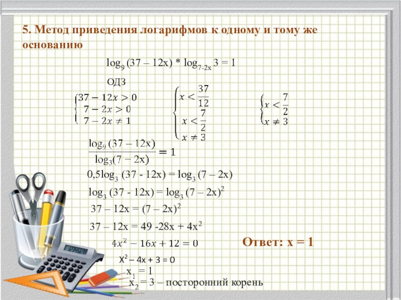 log3 (37 - 12x) = log3 (7 – 2x)2